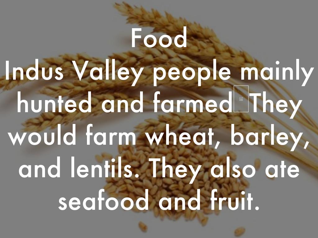 Indus Valley people mainly hunted and farmed🌾They would farm wheat, barley, and lentils. They also ate seafood and fruit.