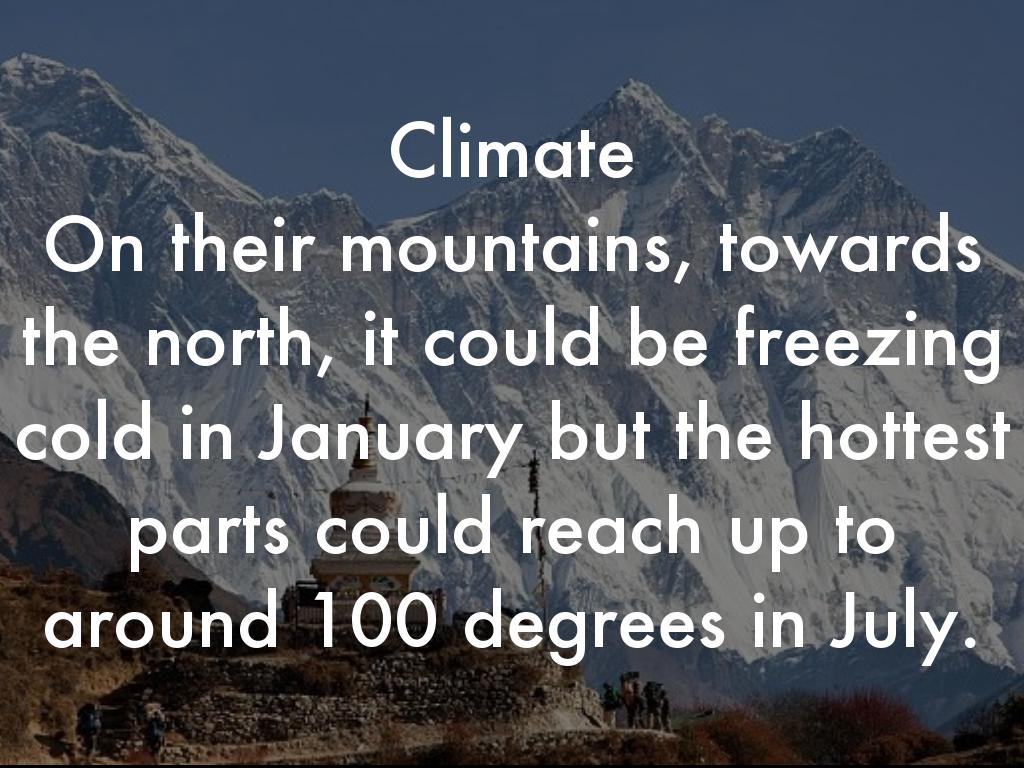 On their mountains, towards the north, it could be freezing cold in January but the hottest parts could reach up to around 100 degrees in July.
