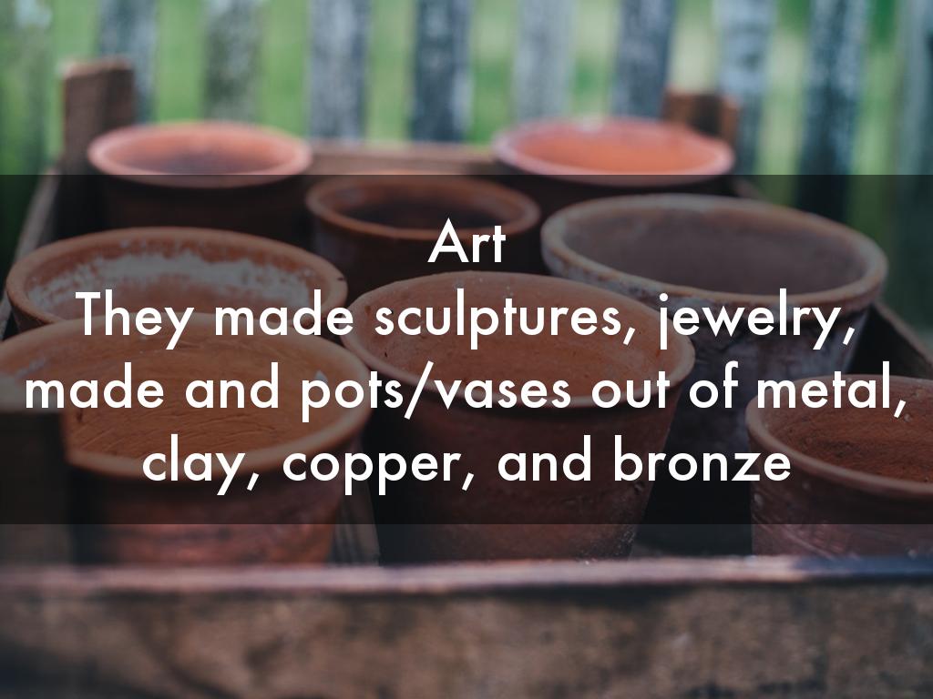 They made sculptures, jewelry, made and pots/vases out of metal, clay, copper, and bronze
