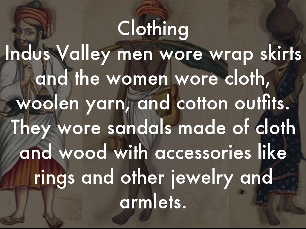 Indus Valley men wore wrap skirts and the women wore cloth, woolen yarn, and cotton outfits. They wore sandals made of cloth and wood with accessories like rings and other jewelry and armlets.