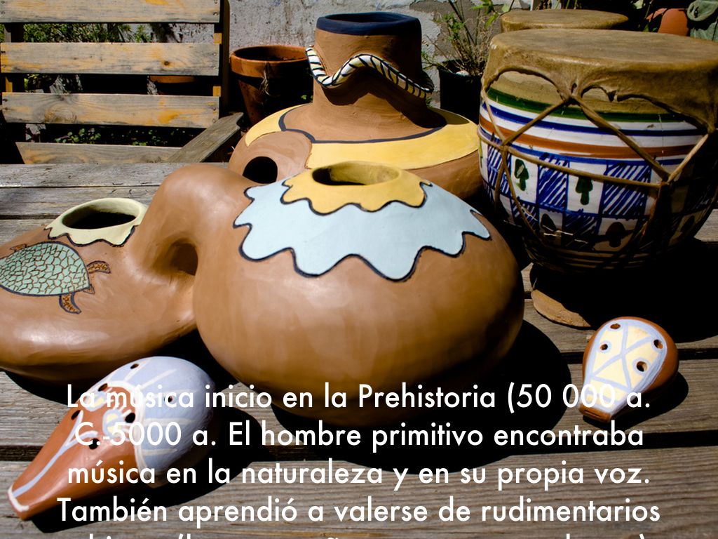 La música inicio en la Prehistoria (50 000 a. C.-5000 a. El hombre primitivo encontraba música en la naturaleza y en su propia voz. También aprendió a valerse de rudimentarios objetos (huesos, cañas, troncos, conchas...) para producir sonidos.