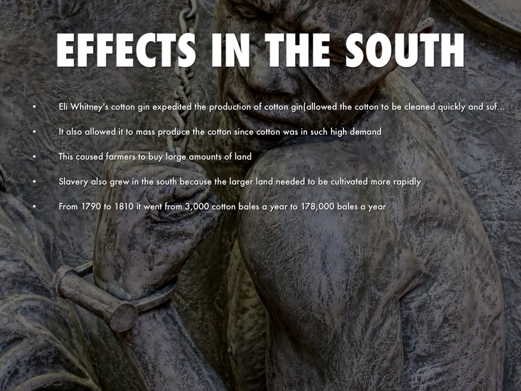 Eli Whitney's cotton gin expedited the production of cotton gin(allowed the cotton to be cleaned quickly and sufficiently)