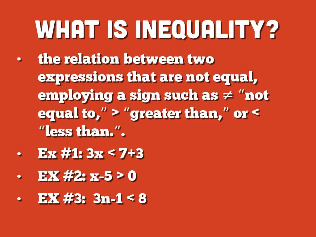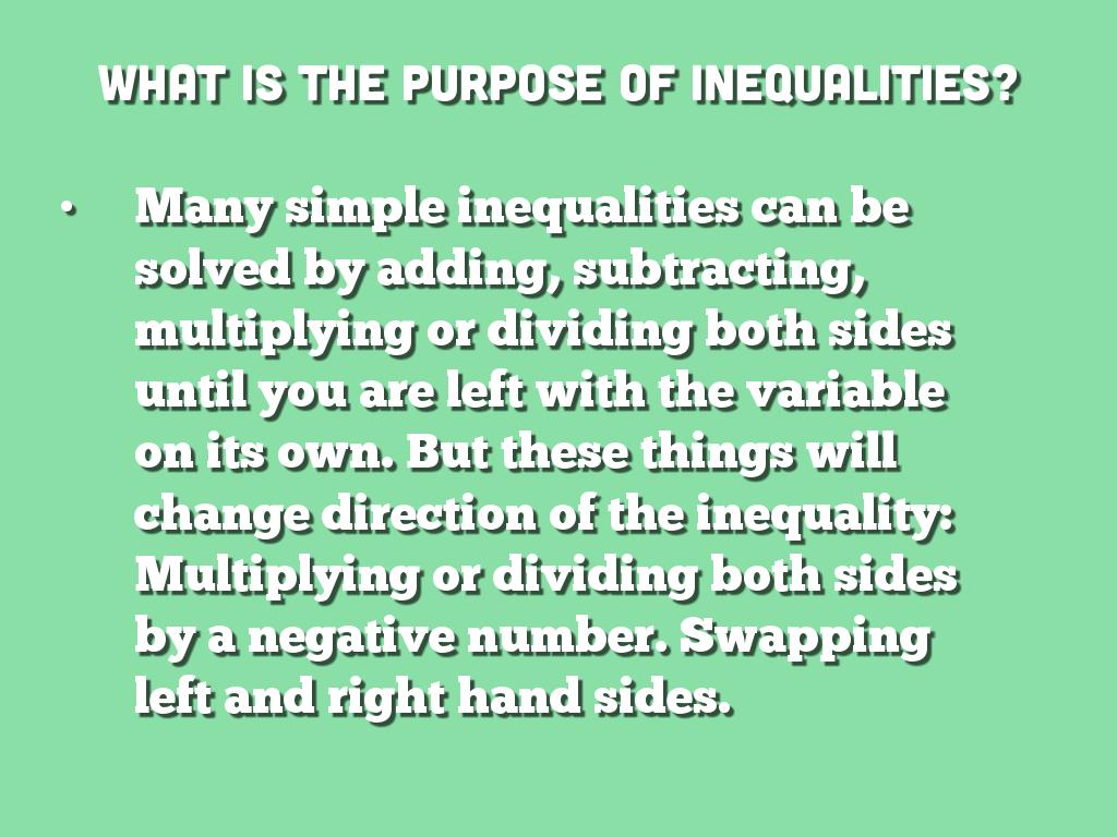 Many simple inequalities can be solved by adding, subtracting, multiplying or dividing both sides until you are left with the variable on its own. But these things will change direction of the inequality: Multiplying or dividing both sides by a negative number. Swapping left and right hand sides.