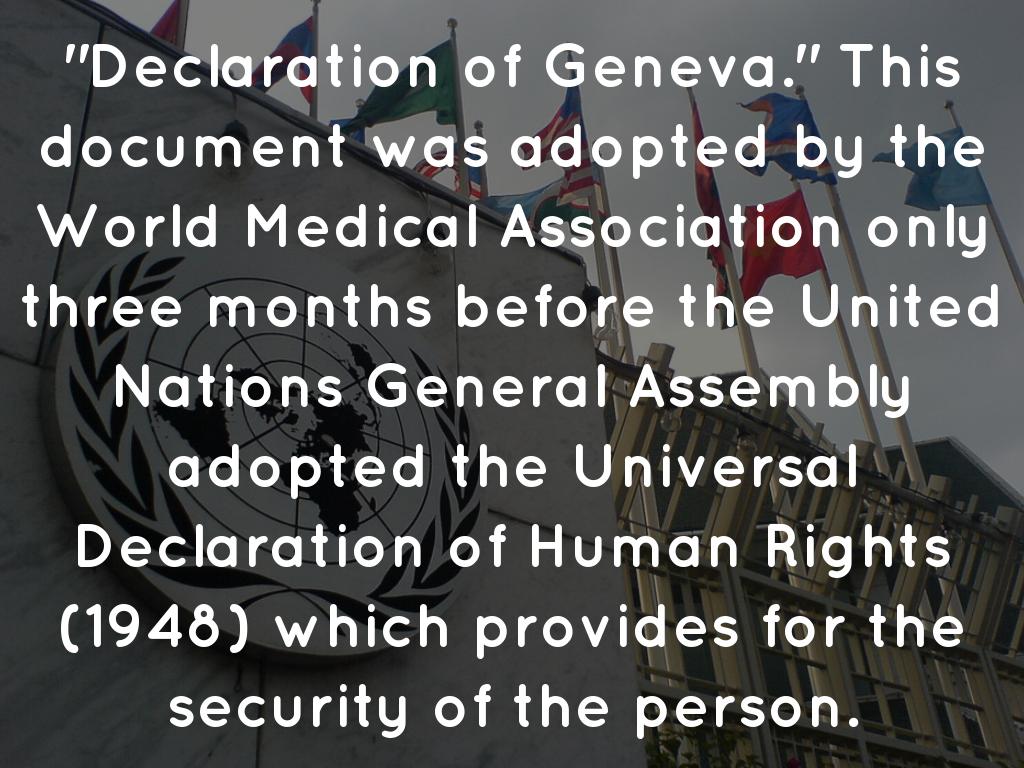 "Declaration of Geneva." This document was adopted by the World Medical Association only three months before the United Nations General Assembly adopted the Universal Declaration of Human Rights (1948) which provides for the security of the person.