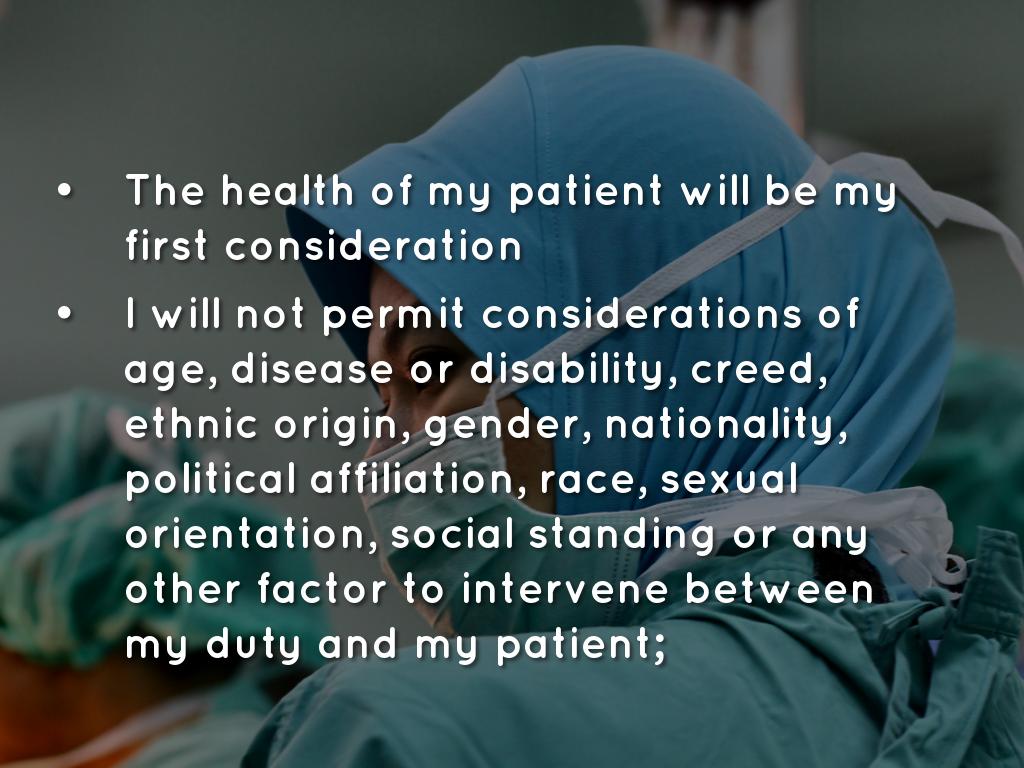 I will not permit considerations of age, disease or disability, creed, ethnic origin, gender, nationality, political affiliation, race, sexual orientation, social standing or any other factor to intervene between my duty and my patient;