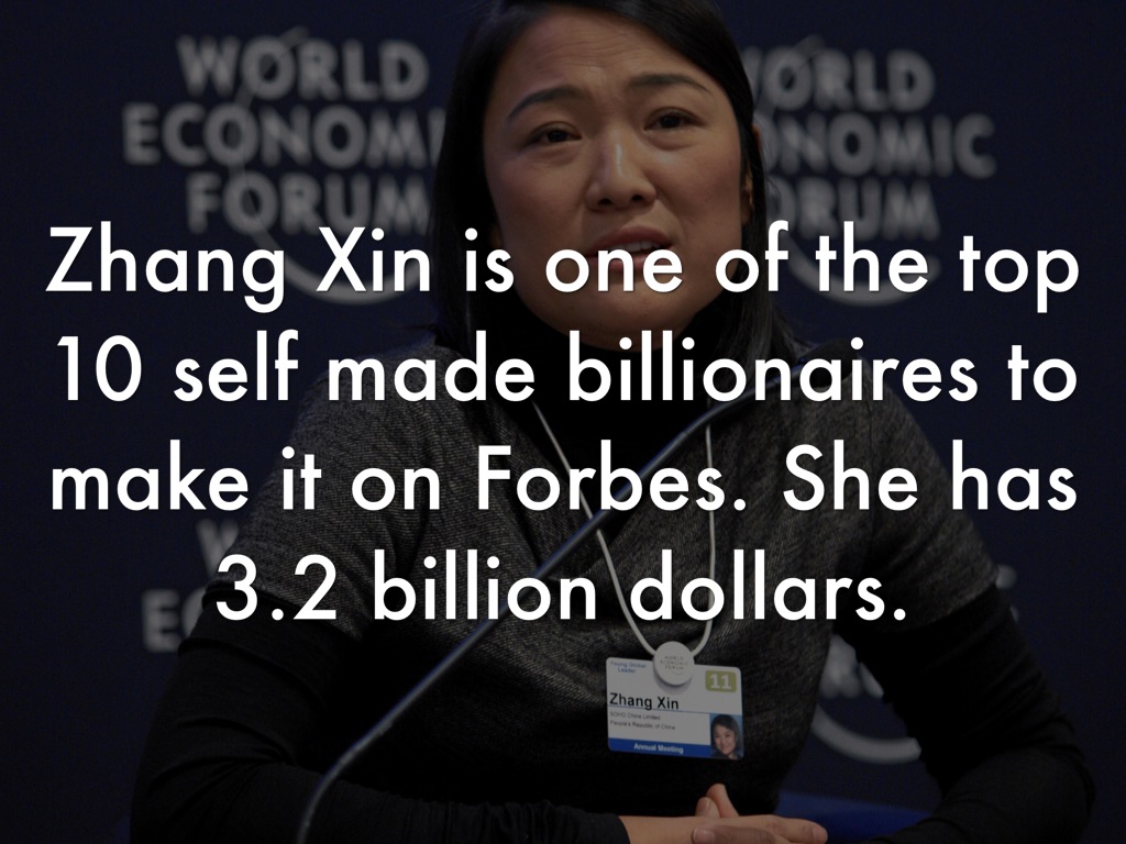 Zhang Xin is one of the top 10 self made billionaires to make it on Forbes. She has 3.2 billion dollars.