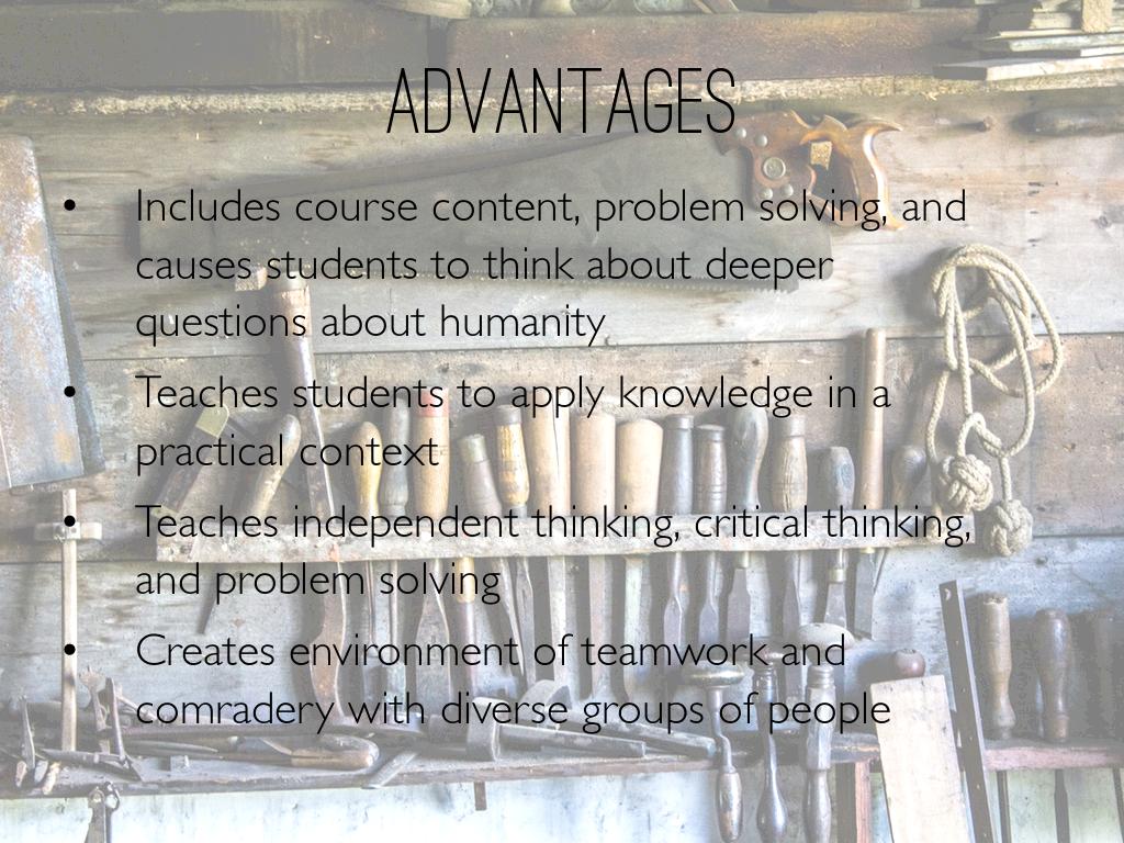 Includes course content, problem solving, and causes students to think about deeper questions about humanity