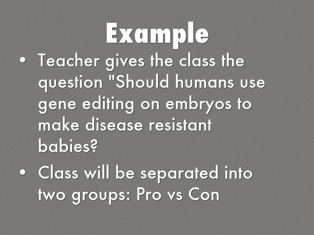 Teacher gives the class the question "Should humans use gene editing on embryos to make disease resistant babies?