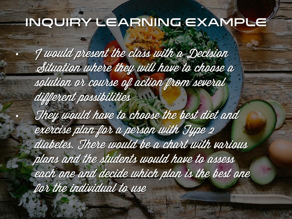 • They would have to choose the best diet and exercise plan for a person with Type 2 diabetes. There would be a chart with various plans and the students would have to assess each one and decide which plan is the best one for the individual to use