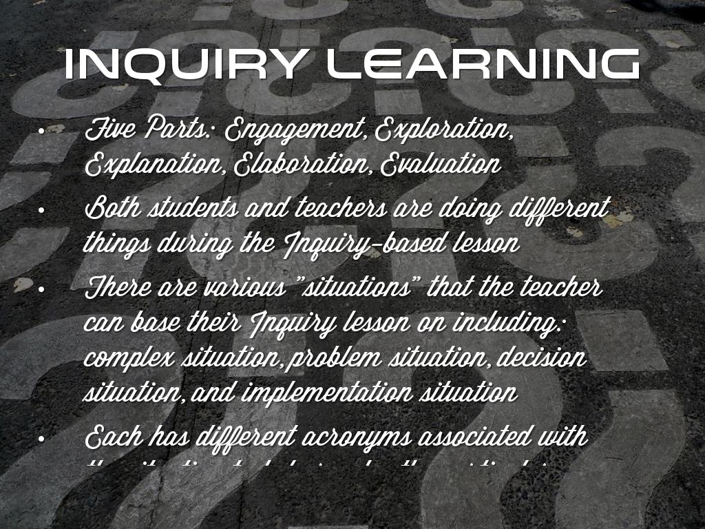 • There are various "situations" that the teacher can base their Inquiry lesson on including: complex situation, problem situation, decision situation, and implementation situation