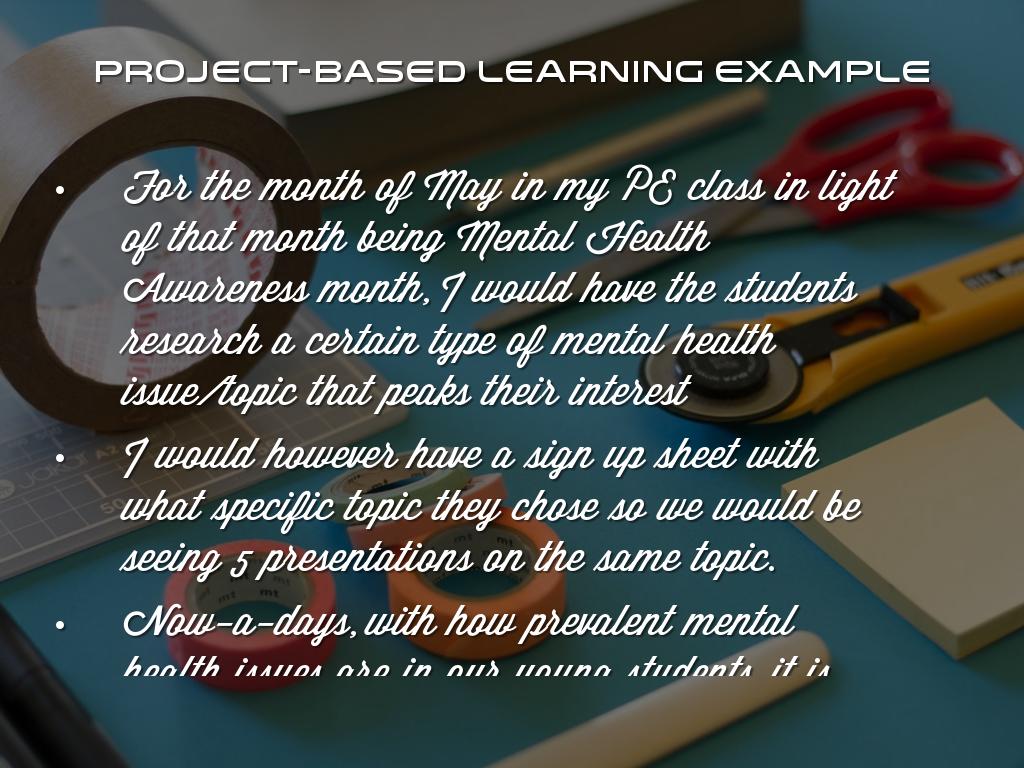 • For the month of May in my PE class in light of that month being Mental Health Awareness month, I would have the students research a certain type of mental health issue/topic that peaks their interest