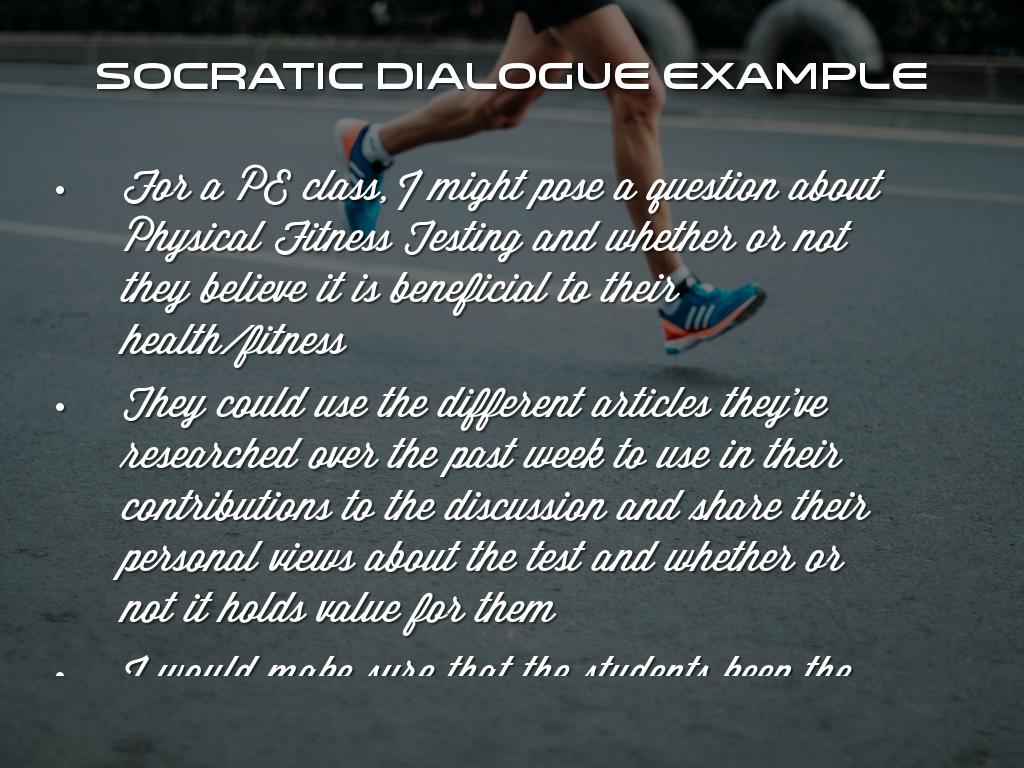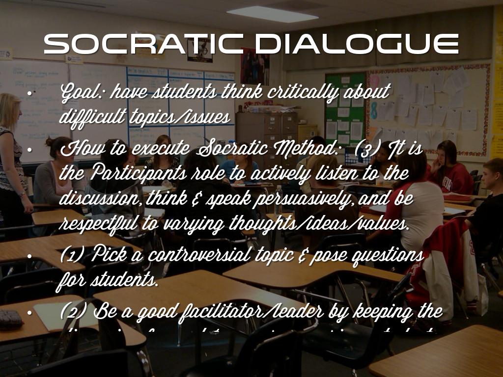 • How to execute Socratic Method: (3) It is the Participants role to actively listen to the discussion, think & speak persuasively, and be respectful to varying thoughts/ideas/values.