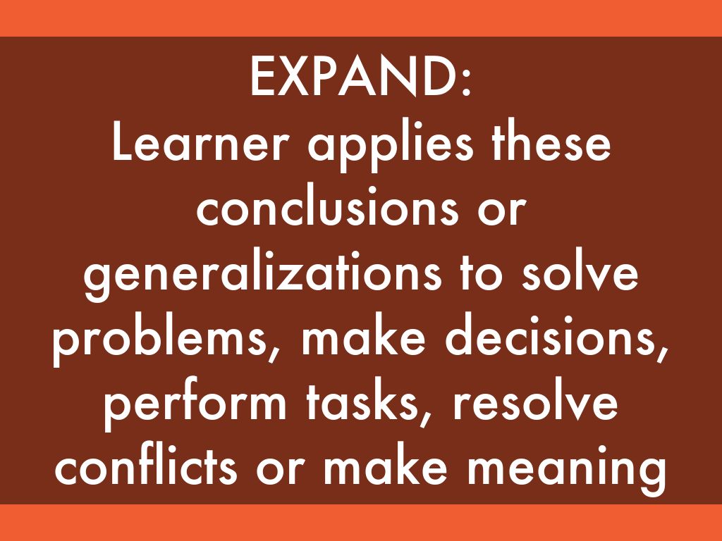 Learner applies these conclusions or generalizations to solve problems, make decisions, perform tasks, resolve conflicts or make meaning