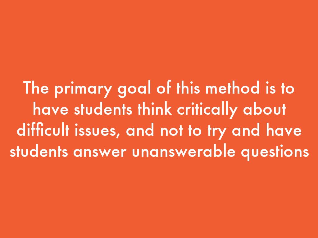 The primary goal of this method is to have students think critically about difficult issues, and not to try and have students answer unanswerable questions