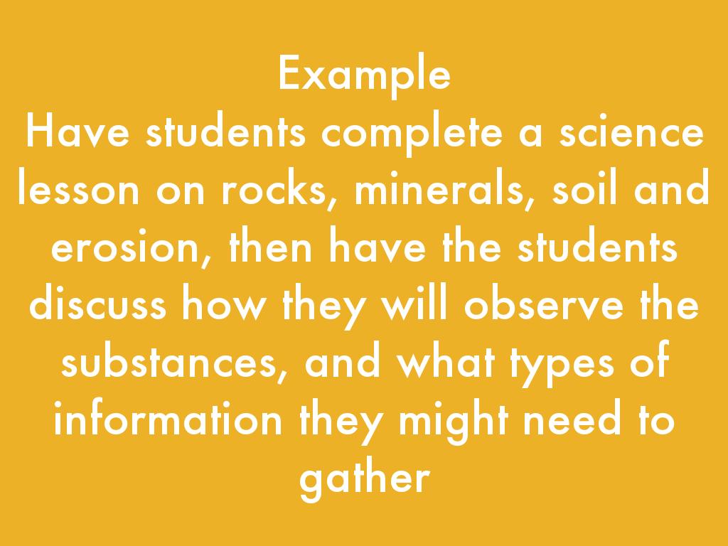 Have students complete a science lesson on rocks, minerals, soil and erosion, then have the students discuss how they will observe the substances, and what types of information they might need to gather