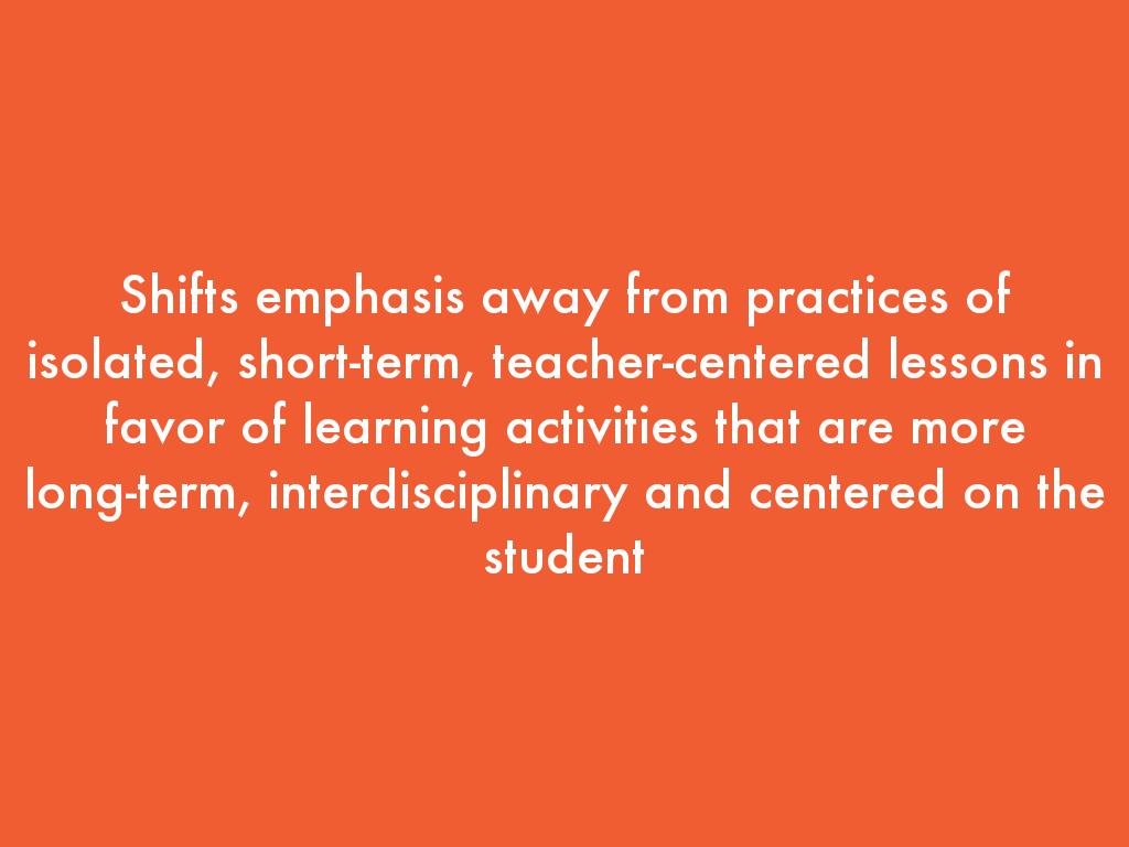 Shifts emphasis away from practices of isolated, short-term, teacher-centered lessons in favor of learning activities that are more long-term, interdisciplinary and centered on the student