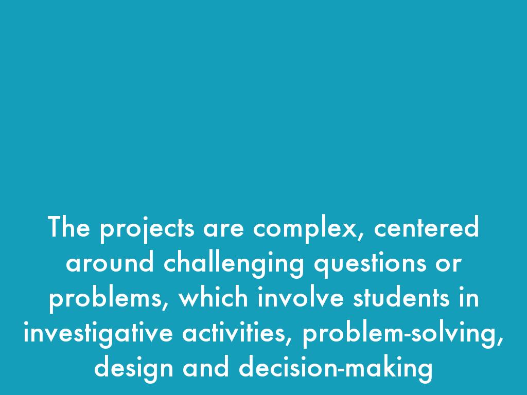 The projects are complex, centered around challenging questions or problems, which involve students in investigative activities, problem-solving, design and decision-making
