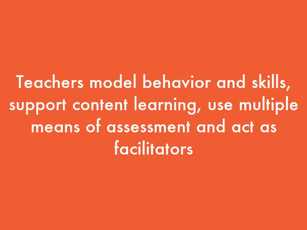 Teachers model behavior and skills, support content learning, use multiple means of assessment and act as facilitators