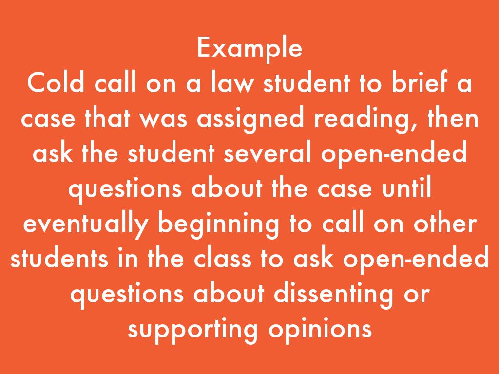 Cold call on a law student to brief a case that was assigned reading, then ask the student several open-ended questions about the case until eventually beginning to call on other students in the class to ask open-ended questions about dissenting or supporting opinions