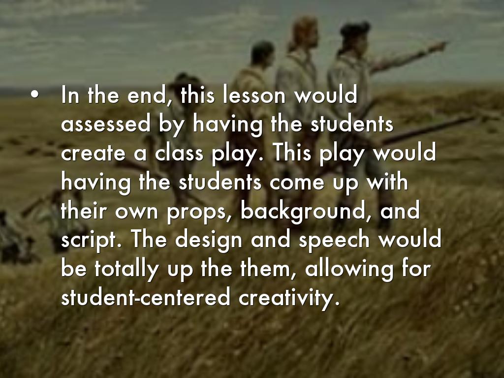 - In the end, this lesson would assessed by having the students create a class play. This play would having the students come up with their own props, background, and script. The design and speech would be totally up the them, allowing for student-centered creativity.
