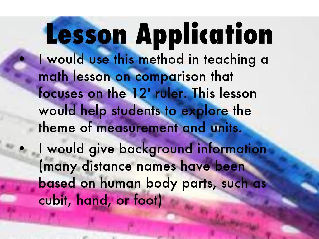- I would use this method in teaching a math lesson on comparison that focuses on the 12' ruler. This lesson would help students to explore the theme of measurement and units.