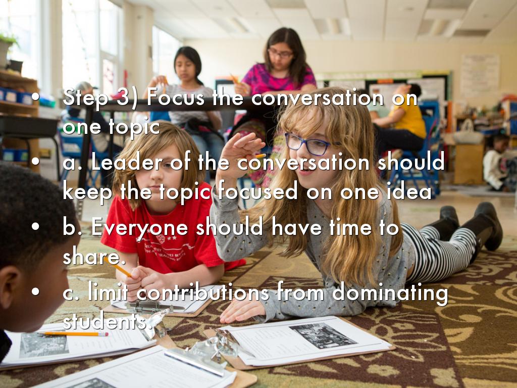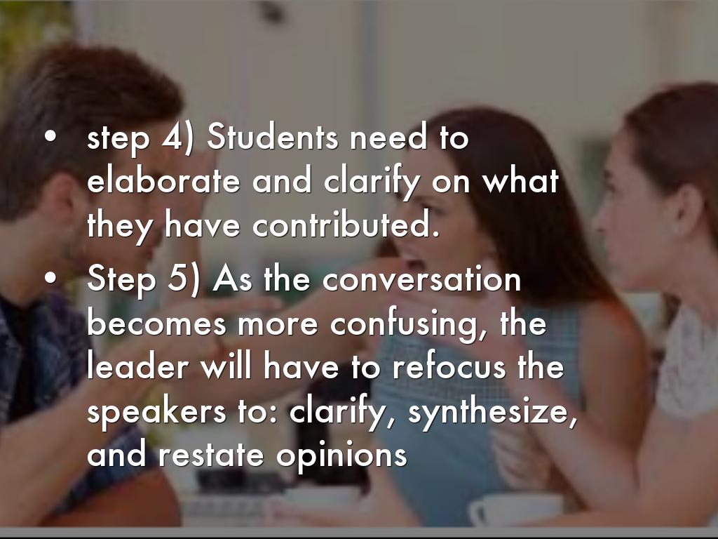 - Step 5) As the conversation becomes more confusing, the leader will have to refocus the speakers to: clarify, synthesize, and restate opinions
