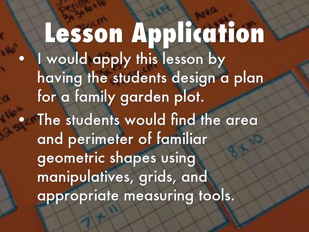 - I would apply this lesson by having the students design a plan for a family garden plot.