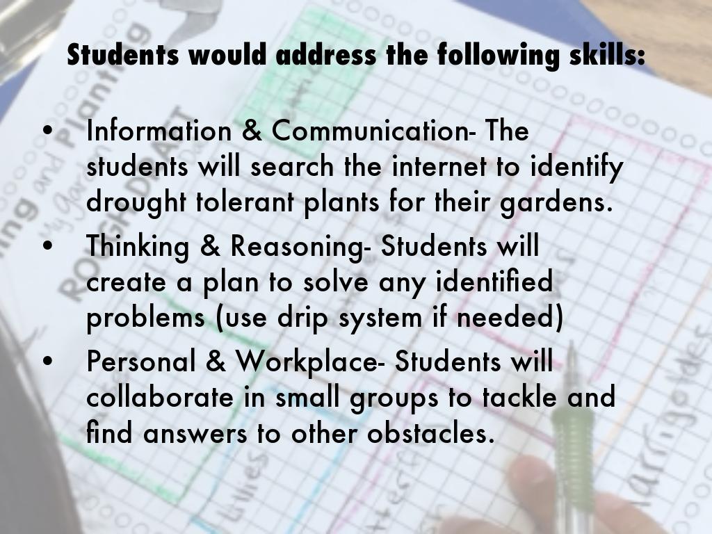 - Information & Communication- The students will search the internet to identify drought tolerant plants for their gardens.