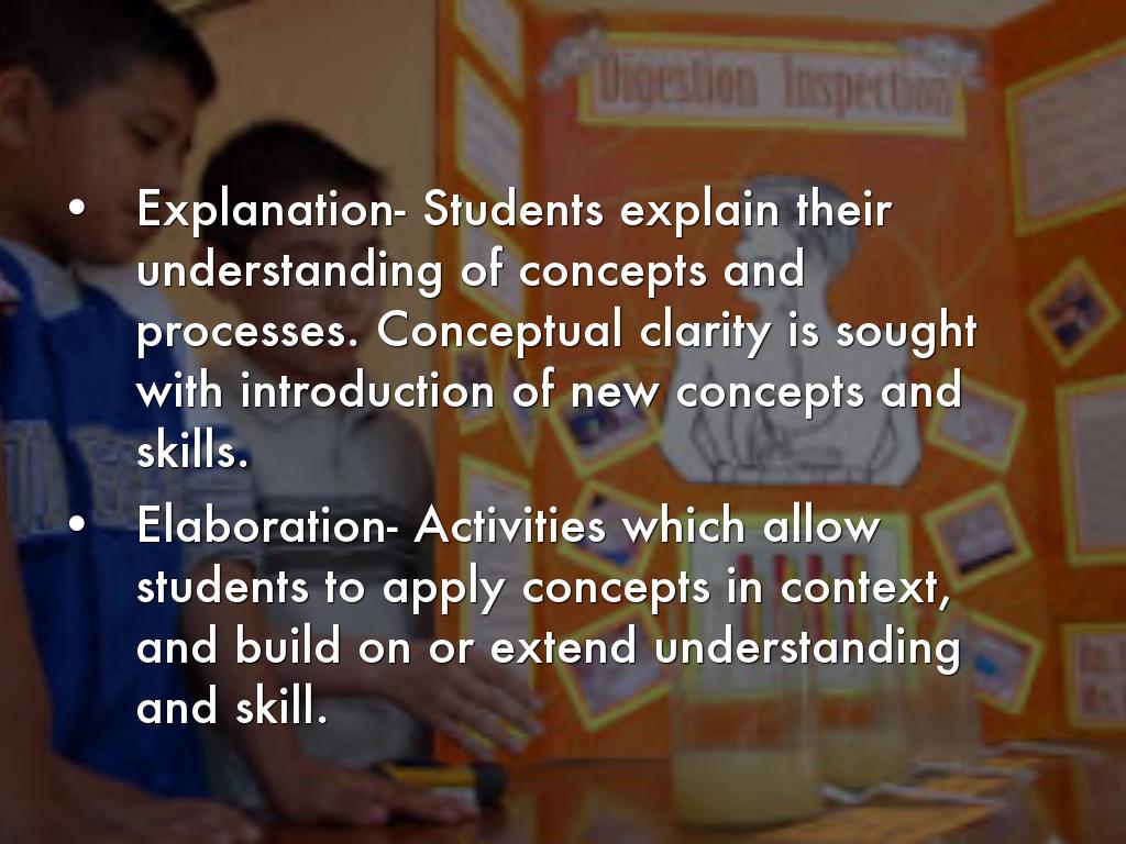 - Explanation- Students explain their understanding of concepts and processes. Conceptual clarity is sought with introduction of new concepts and skills.