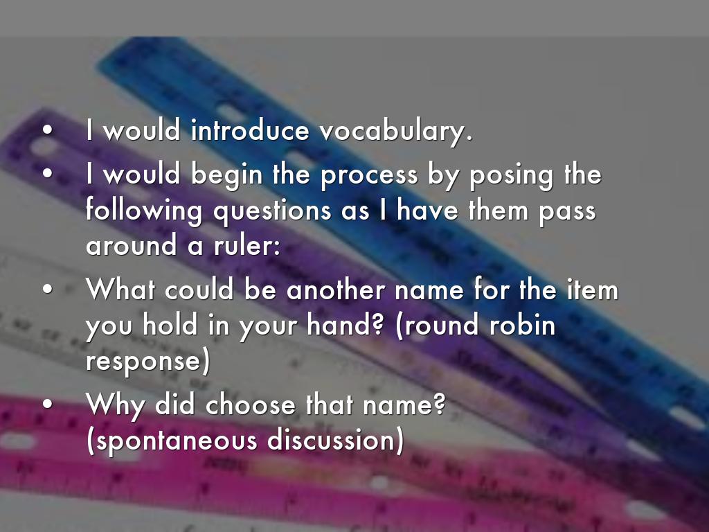 - I would begin the process by posing the following questions as I have them pass around a ruler: