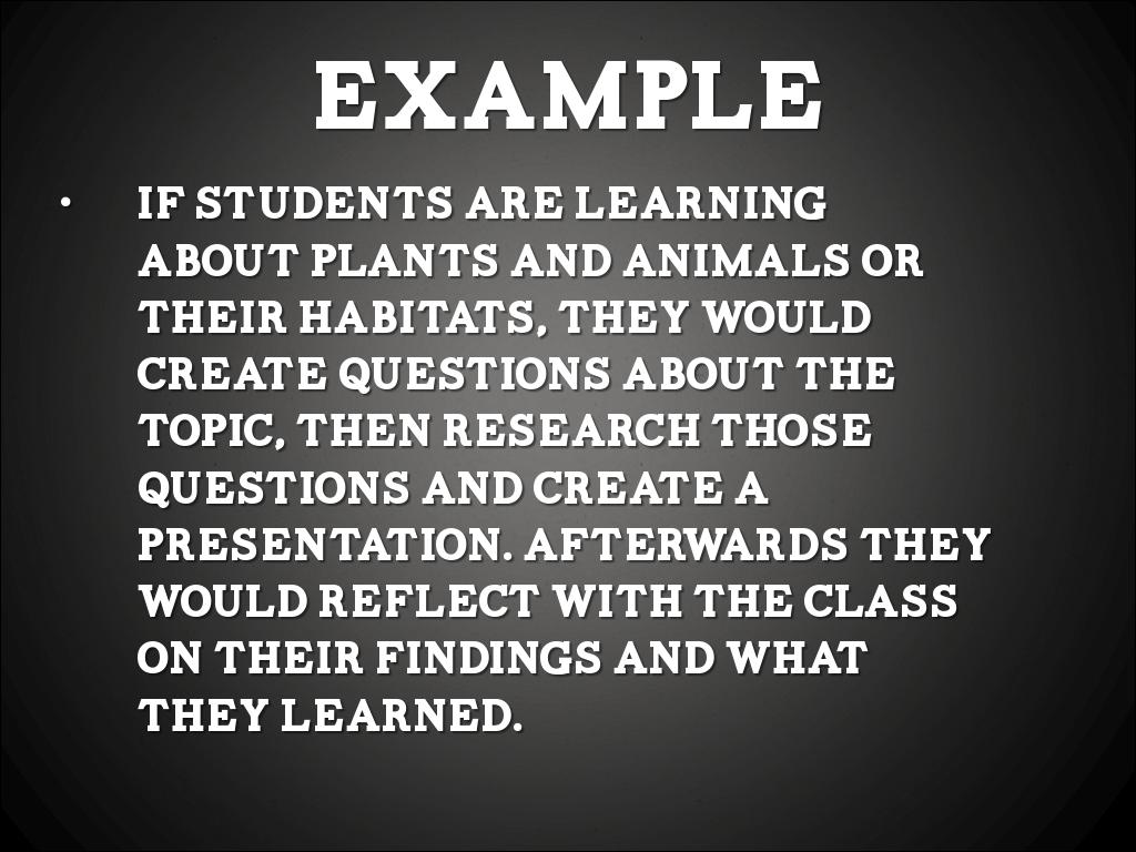 If students are learning about plants and animals or their habitats, they would create questions about the topic, then research those questions and create a presentation. Afterwards they would reflect with the class on their findings and what they learned.