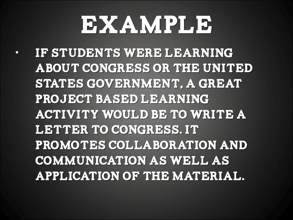 If students were learning about congress or the United States Government, a great project based learning activity would be to write a letter to congress. It promotes collaboration and communication as well as application of the material.