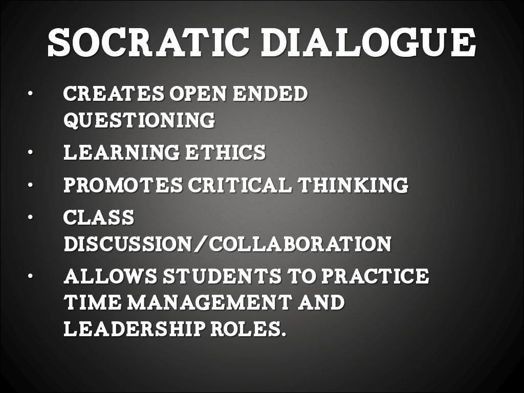 Students learning a new topic in history might be asked to create questions about the topic or may be presented with questions from the teacher. A class discussion will take place where the leader will make sure to clarify, synthesize and restate opinions being discussed. Students need to be able to defend their positioning and statements.