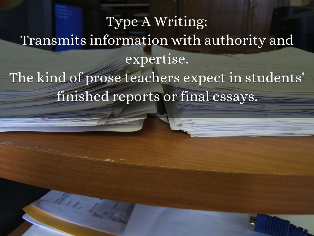 "Our students should be learning in a strong, unpretentious prose that will carry their thoughts about the world they live in...In other words: writing with voice. One reason their report writing so often sounds awkwardly formal and pretentious may be that we are rushing our students too quickly from Type B to Type A writing: asking them to write as experts on a subject before they have digested their ideas, before they are ready. -William Zinsswer