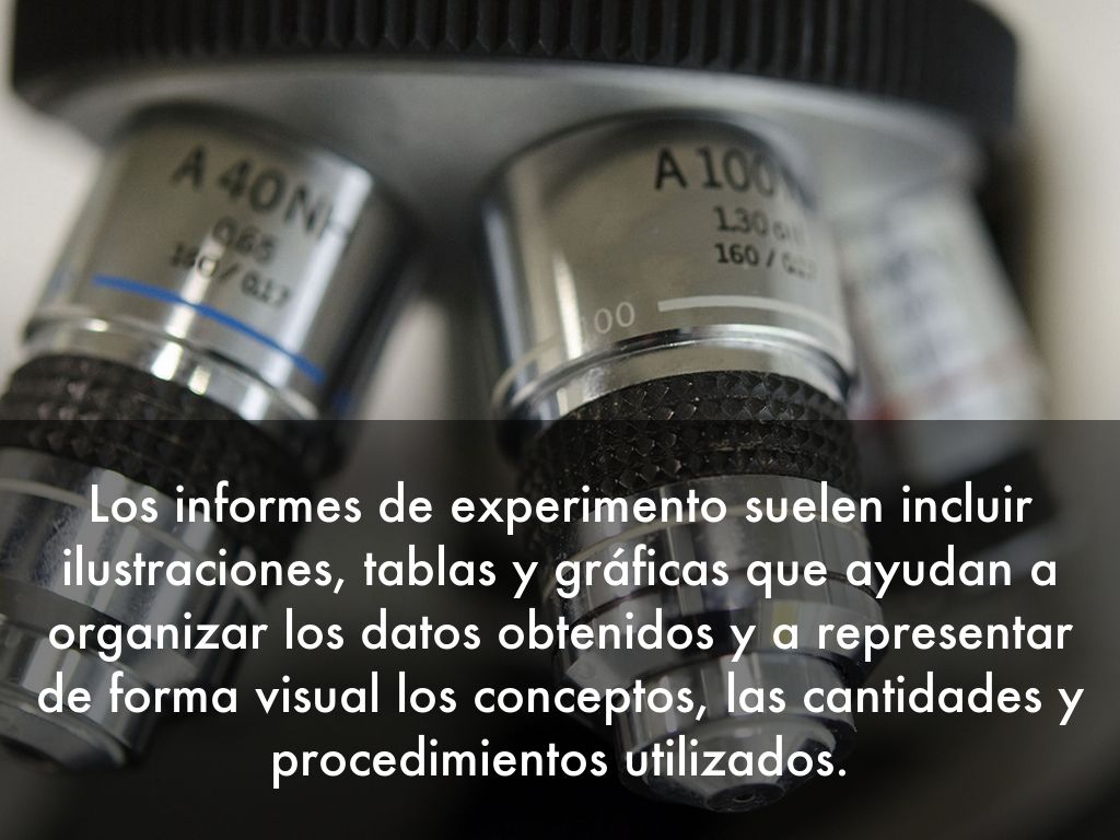 Los informes de experimento suelen incluir ilustraciones, tablas y gráficas que ayudan a organizar los datos obtenidos y a representar de forma visual los conceptos, las cantidades y procedimientos utilizados.