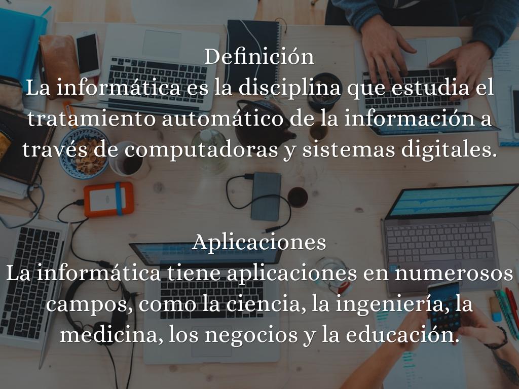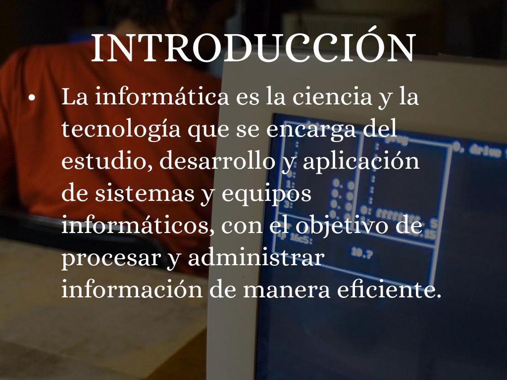 • La informática es la ciencia y la tecnología que se encarga del estudio, desarrollo y aplicación de sistemas y equipos informáticos, con el objetivo de procesar y administrar información de manera eficiente.