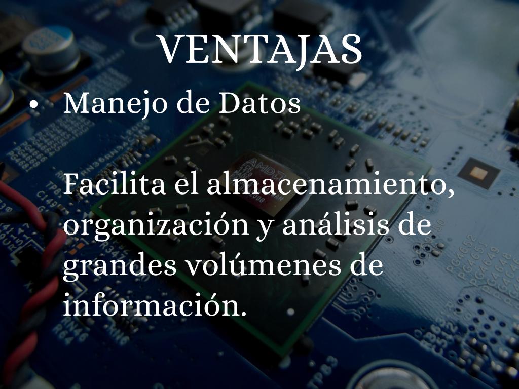 • Manejo de Datos Facilita el almacenamiento, organización y análisis de grandes volúmenes de información.