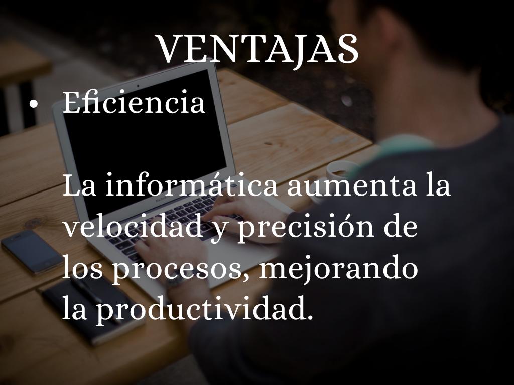 • Eficiencia La informática aumenta la velocidad y precisión de los procesos, mejorando la productividad.