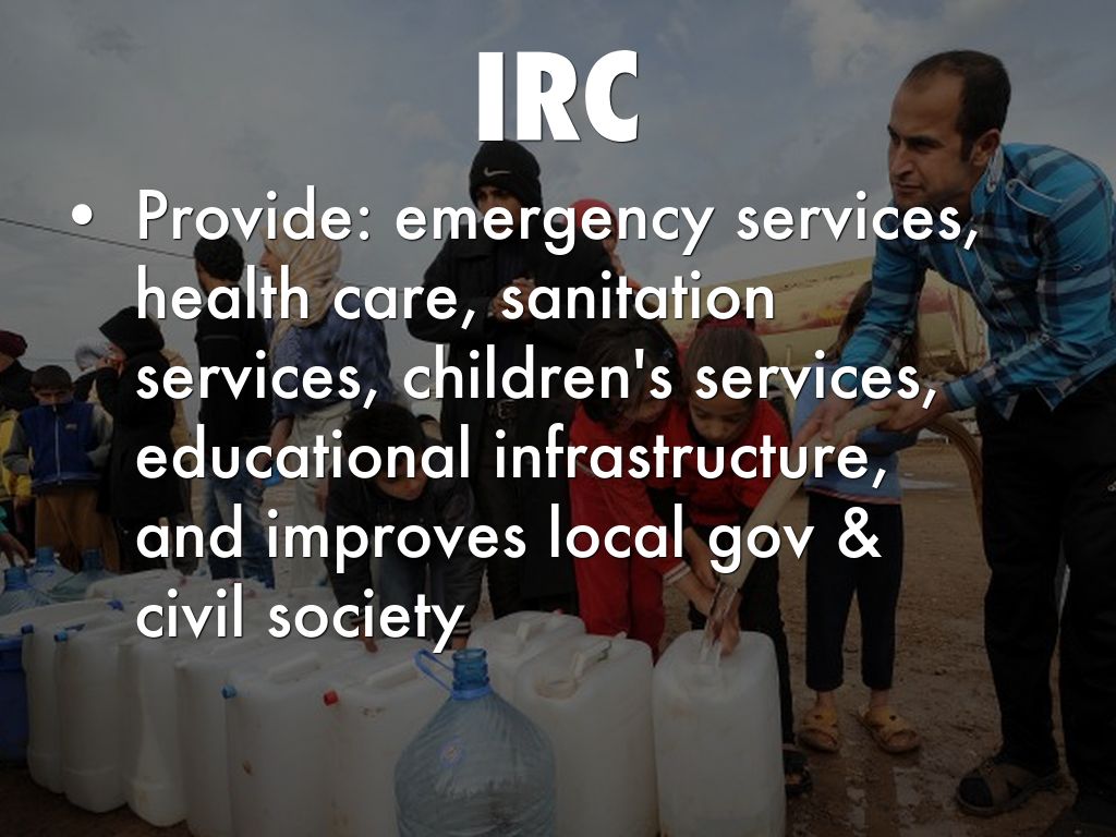 Provide: emergency services, health care, sanitation services, children's services, educational infrastructure, and improves local gov & civil society