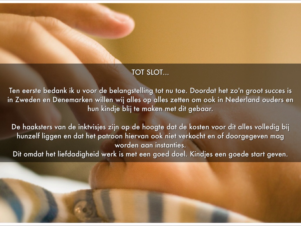Ten eerste bedank ik u voor de belangstelling tot nu toe. Doordat het zo'n groot succes is in Zweden en Denemarken willen wij alles op alles zetten om ook in Nederland ouders en hun kindje blij te maken met dit gebaar.