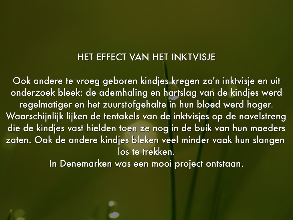 Ook andere te vroeg geboren kindjes kregen zo'n inktvisje en uit onderzoek bleek: de ademhaling en hartslag van de kindjes werd regelmatiger en het zuurstofgehalte in hun bloed werd hoger.