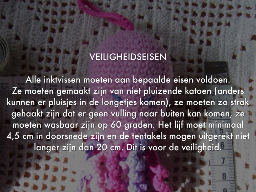 Alle inktvissen moeten aan bepaalde eisen voldoen. Ze moeten gemaakt zijn van niet pluizende katoen (anders kunnen er pluisjes in de longetjes komen), ze moeten zo strak gehaakt zijn dat er geen vulling naar buiten kan komen, ze moeten wasbaar zijn op 60 graden. Het lijf moet minimaal 4,5 cm in doorsnede zijn en de tentakels mogen uitgerekt niet langer zijn dan 20 cm. Dit is voor de veiligheid.