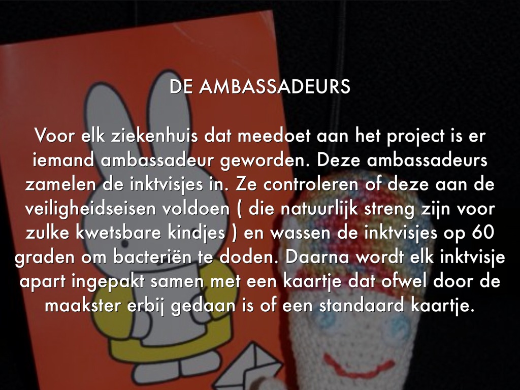 Voor elk ziekenhuis dat meedoet aan het project is er iemand ambassadeur geworden. Deze ambassadeurs zamelen de inktvisjes in. Ze controleren of deze aan de veiligheidseisen voldoen ( die natuurlijk streng zijn voor zulke kwetsbare kindjes ) en wassen de inktvisjes op 60 graden om bacteriën te doden. Daarna wordt elk inktvisje apart ingepakt samen met een kaartje dat ofwel door de maakster erbij gedaan is of een standaard kaartje.