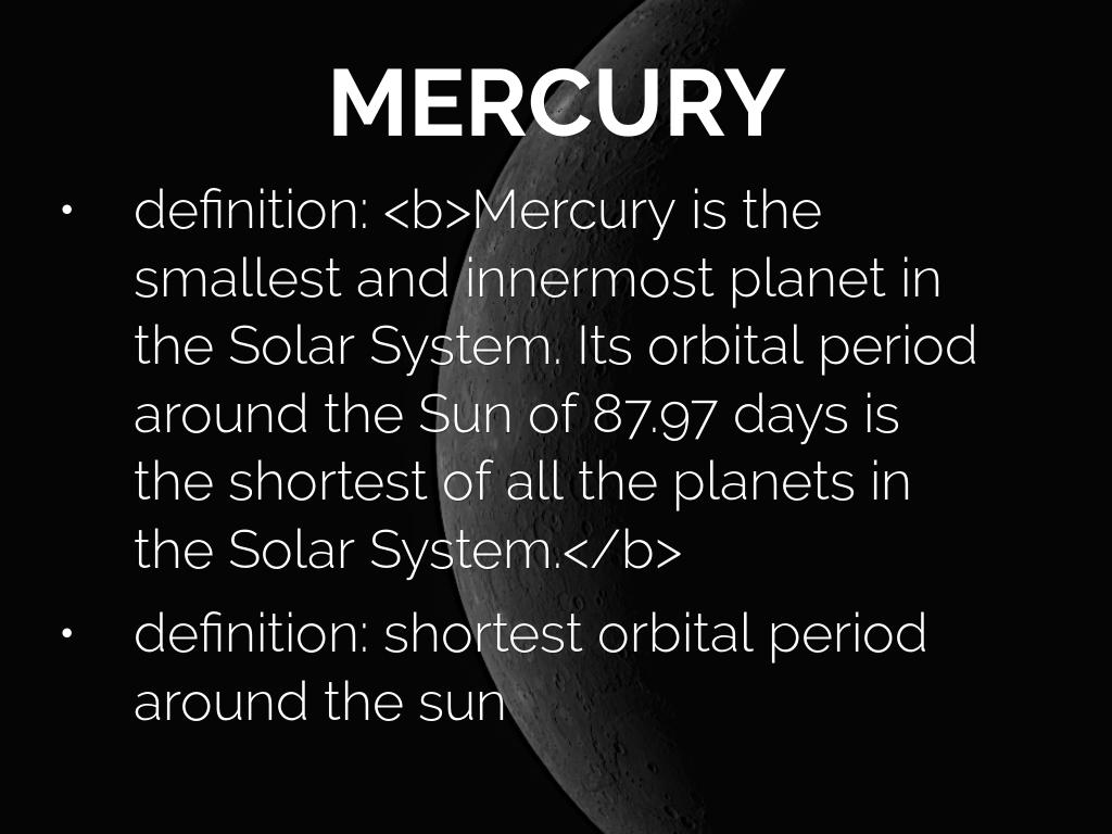 definition: Mercury is the smallest and innermost planet in the Solar System. Its orbital period around the Sun of 87.97 days is the shortest of all the planets in the Solar System.