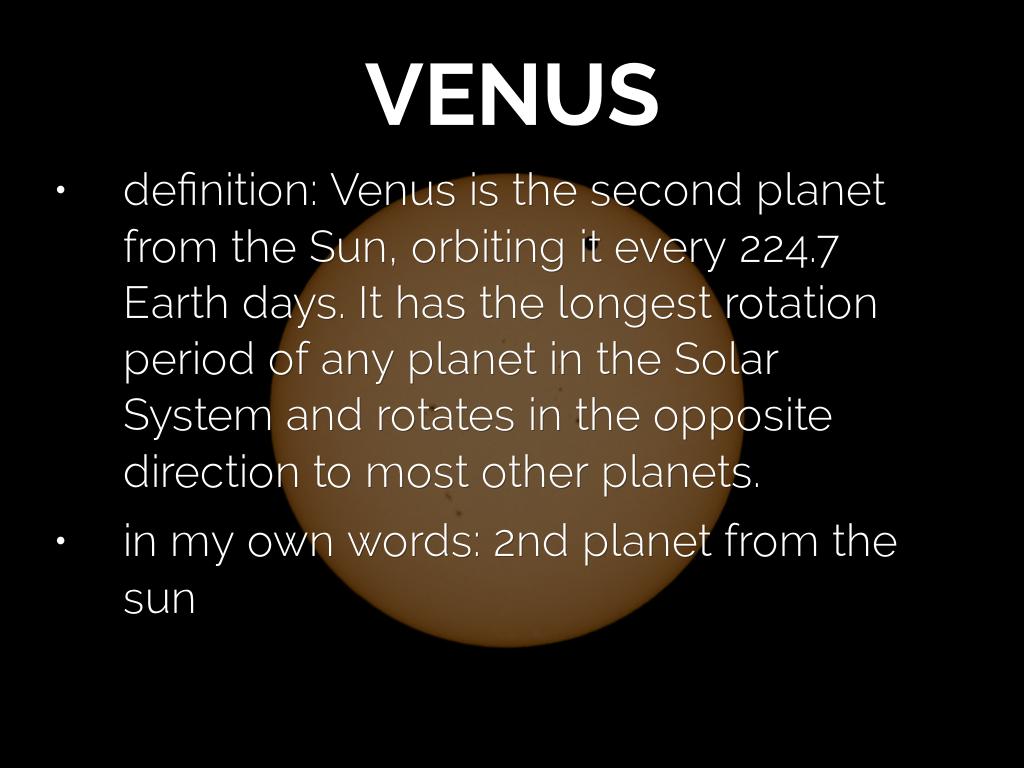 definition: Venus is the second planet from the Sun, orbiting it every 224.7 Earth days. It has the longest rotation period of any planet in the Solar System and rotates in the opposite direction to most other planets.