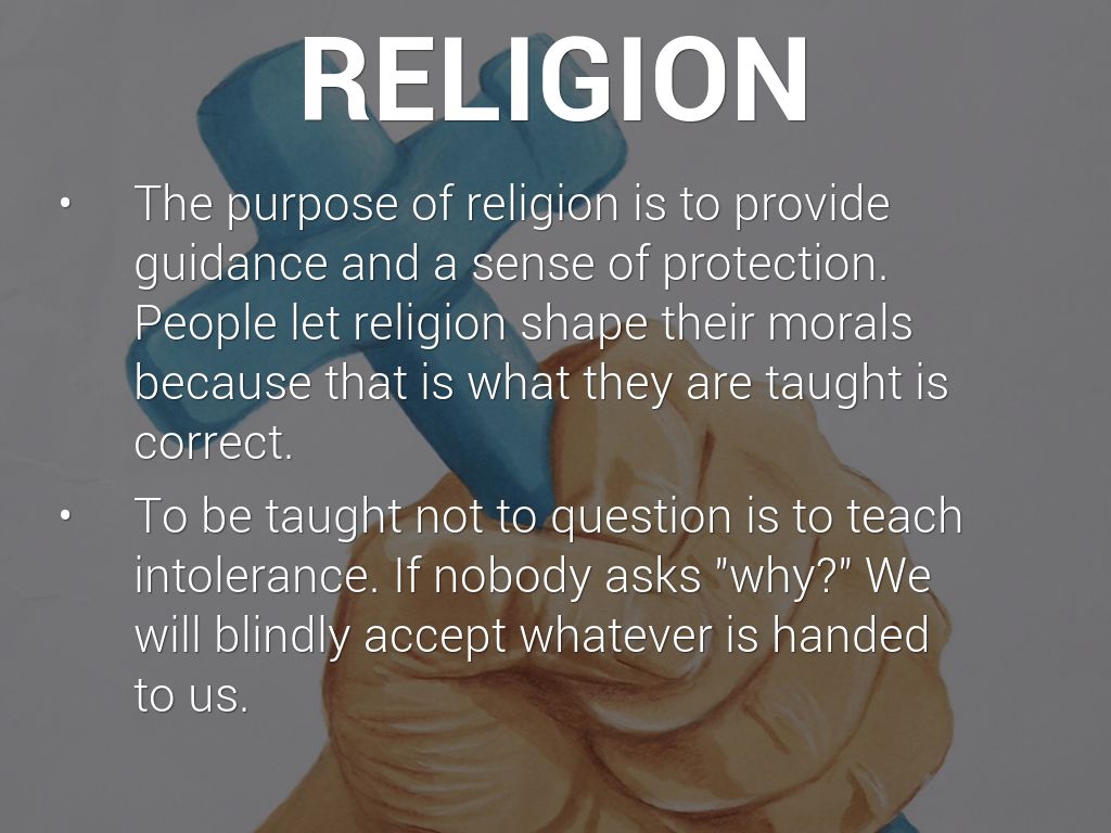 - The purpose of religion is to provide guidance and a sense of protection. People let religion shape their morals because that is what they are taught is correct.