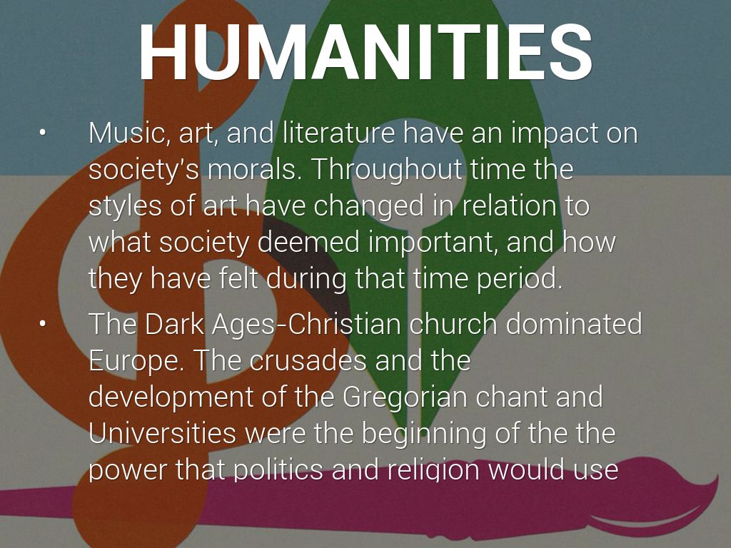- The Dark Ages-Christian church dominated Europe. The crusades and the development of the Gregorian chant and Universities were the beginning of the the power that politics and religion would use to influence societies.