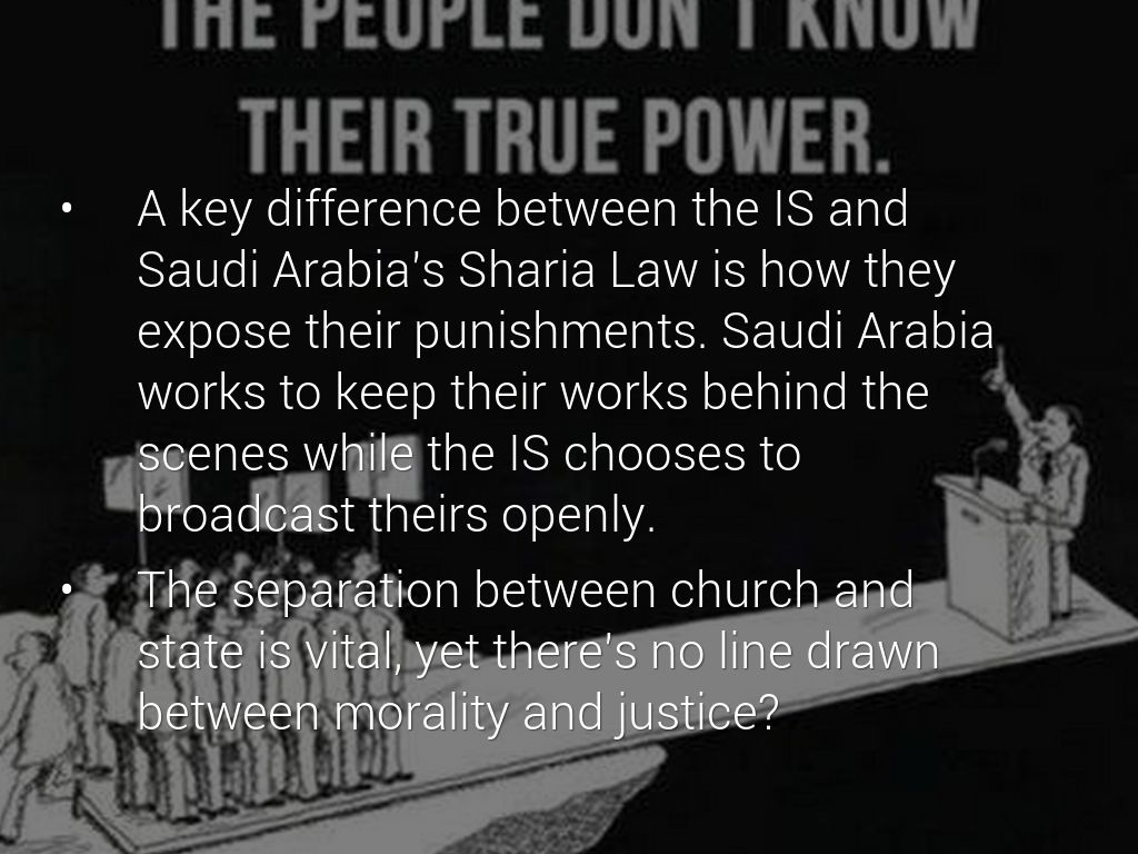 - A key difference between the IS and Saudi Arabia's Sharia Law is how they expose their punishments. Saudi Arabia works to keep their works behind the scenes while the IS chooses to broadcast theirs openly.