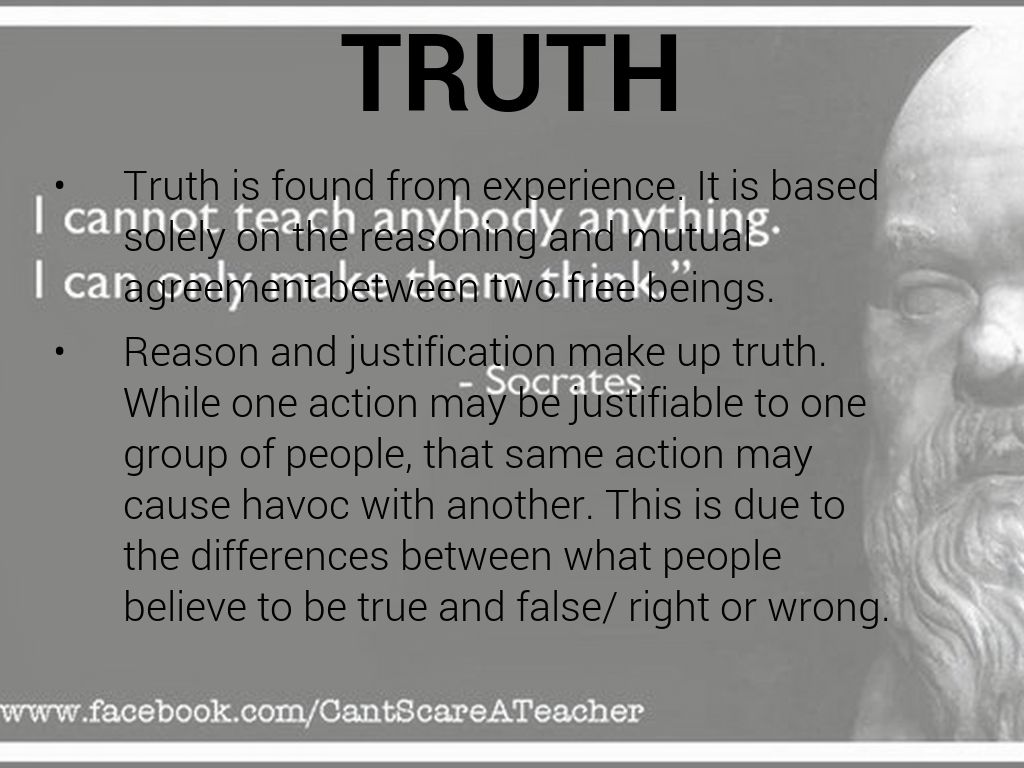 - Reason and justification make up truth. While one action may be justifiable to one group of people, that same action may cause havoc with another. This is due to the differences between what people believe to be true and false/ right or wrong.