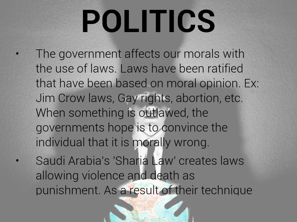 - The government affects our morals with the use of laws. Laws have been ratified that have been based on moral opinion. Ex: Jim Crow laws, Gay rights, abortion, etc. When something is outlawed, the governments hope is to convince the individual that it is morally wrong.